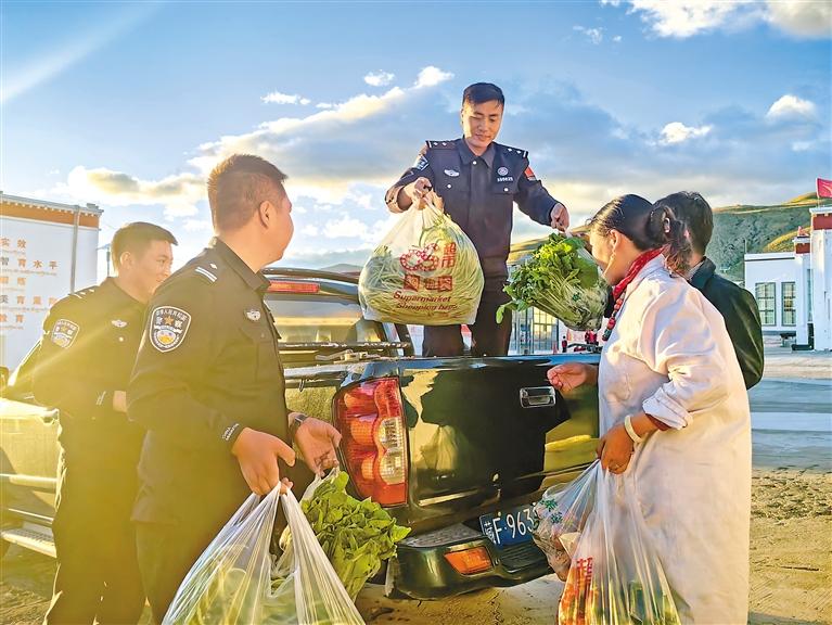 塔爾欽邊境派出所民警為群眾送去種植的蔬菜。