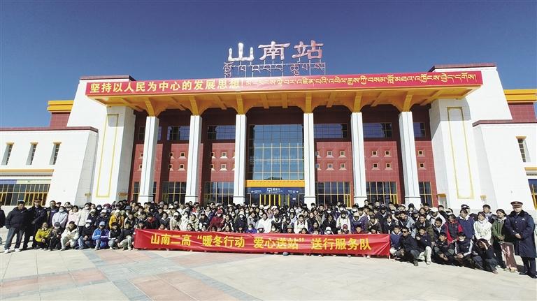 山南市第二高級中學“暖冬行動 愛心送站”送行服務(wù)隊和學生們合影。 圖由格桑央金提供