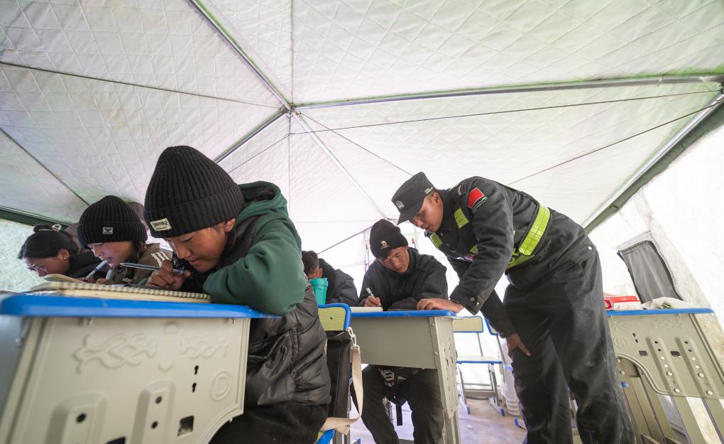在西藏日喀則市定日縣長所鄉(xiāng)嘎布村安置點(diǎn)的帳篷內(nèi),民警劉鑫磊一手指了指黑板上的題目,一手拿著資料,耐心地給高三學(xué)生講解。5名學(xué)生坐在課桌前,低著頭,快速地在草稿紙上演算著。