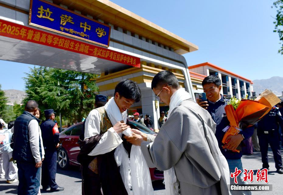 6月9日上午11時(shí)30分,西藏自治區(qū)2025年普通高考完成所有科目考試。圖為結(jié)束考試的考生們?cè)诶_市拉薩中學(xué)考點(diǎn)外互獻(xiàn)哈達(dá)。