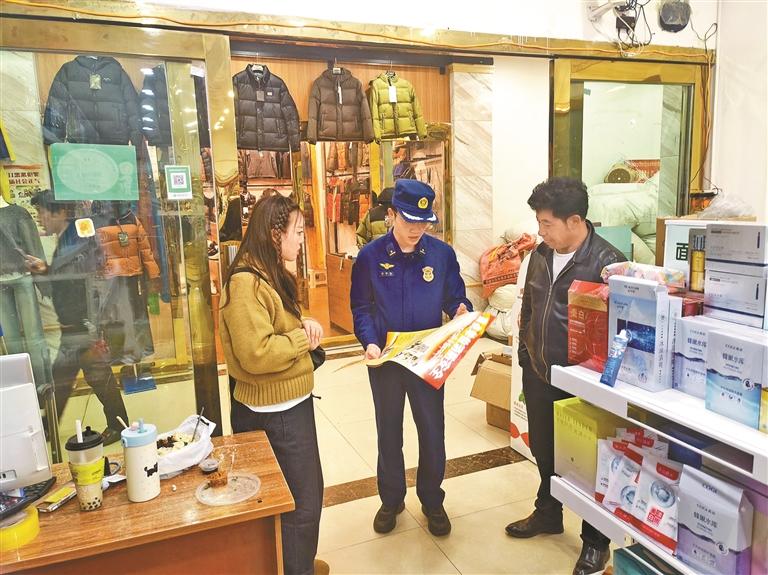 拉薩市消防救援支隊(duì)宣傳員為商貿(mào)市場(chǎng)商鋪店主強(qiáng)調(diào)消防安全。