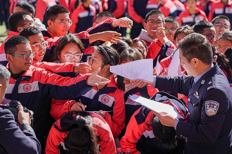 西藏“開學(xué)第一課”網(wǎng)絡(luò)普法進(jìn)校園活動(dòng)中,民警為學(xué)生發(fā)放普法宣傳知識(shí)手冊(cè)。記者 貢曲羅杰 攝