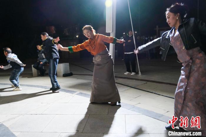 4月26日晚,拉薩柳梧新區(qū)的上班族嘎瑪石努(右二)跳夜間鍋莊舞。中新社記者 江飛波 攝