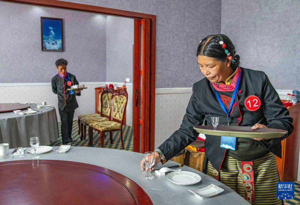 5月11日,在那曲市聶榮縣尼瑪鄉(xiāng),農(nóng)牧民選手們在進(jìn)行酒店服務(wù)技能的比賽。新華社記者 陳尚才 攝 ??