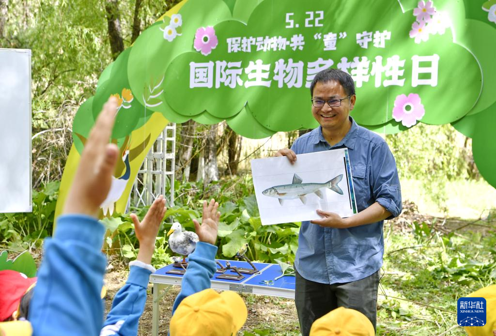 5月22日,西藏大學生態(tài)環(huán)境學院教授張繼峰向小學生普及有關西藏魚類的知識。新華社記者 張汝鋒 攝