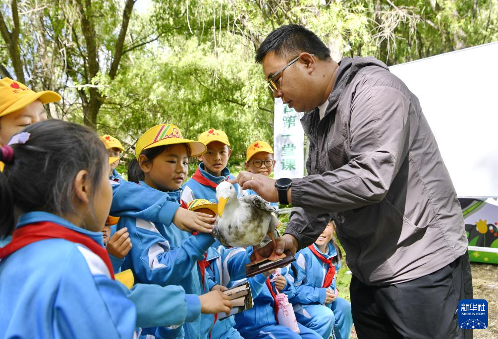 5月22日,西藏大學生態(tài)環(huán)境學院助理實驗師朱文琎向小學生展示鳥類標本。新華社記者 張汝鋒 攝