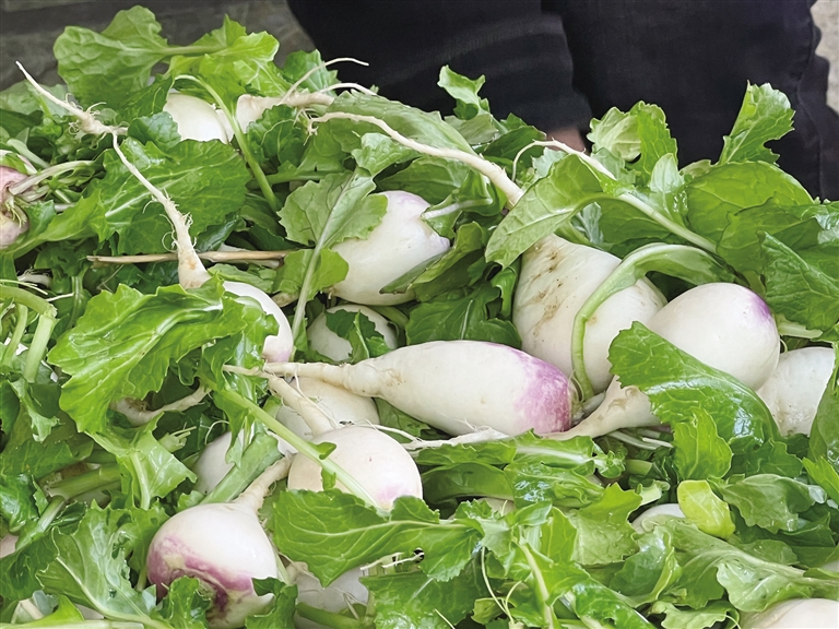 “這些‘妞瑪’都是昨天剛從地里挖的,20元一斤?!睌傊鞔稳噬2颊碇丝鹬械男迈r“妞瑪”,瞬間吸引了不少顧客。次仁桑布家住曲水縣其奴村,據(jù)他介紹,村里家家戶戶每年都會種植幾畝“妞瑪”,品相好的拿到拉薩銷售,其余部分則作為家畜的營養(yǎng)品。5月25日一大早,次仁桑布便帶著自家的“妞瑪”來拉薩銷售,“這些‘妞瑪’全是昨晚洗好、晾好的,一到市場上便成了‘香餑餑’,一上午就能賣掉四五十斤。”
