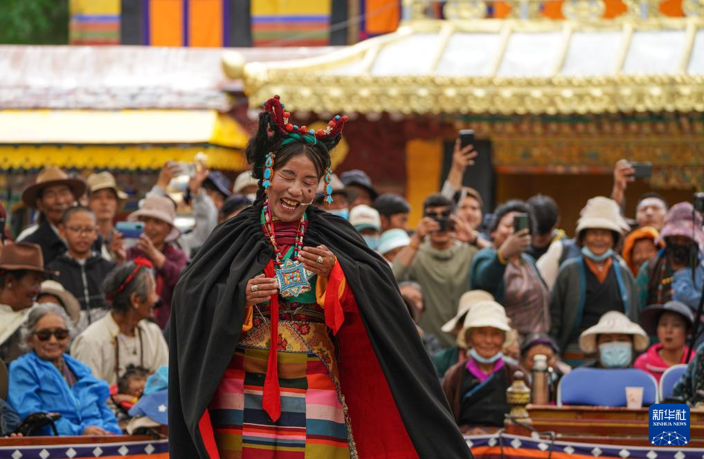 8月8日,山南市洛扎縣曲措藏戲隊在拉薩羅布林卡表演傳統(tǒng)藏戲《卓瓦桑姆》。新華社記者 晉美多吉 攝
