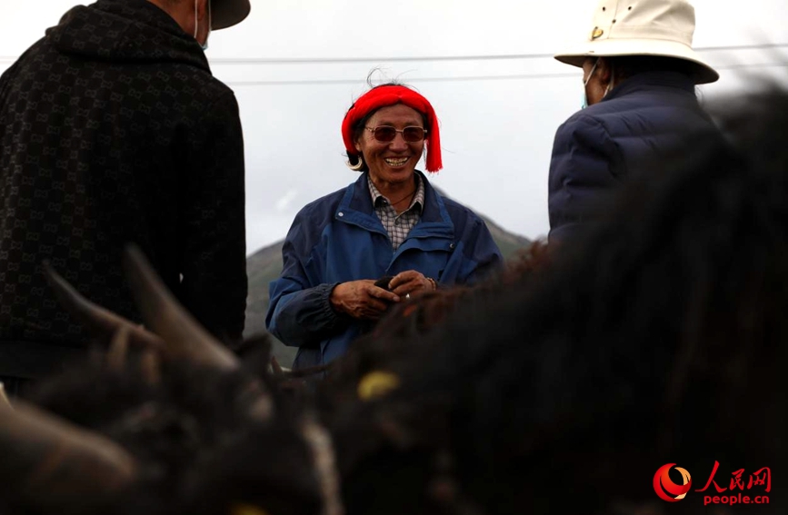 初到當雄縣郭慶村,剛好趕上了建檔立卡監(jiān)測的村民們在排隊等著領(lǐng)取牦牛。大家圍在牧場旁,你一言我一語地在討論未來生活的規(guī)劃,談笑間難掩喜悅之情。