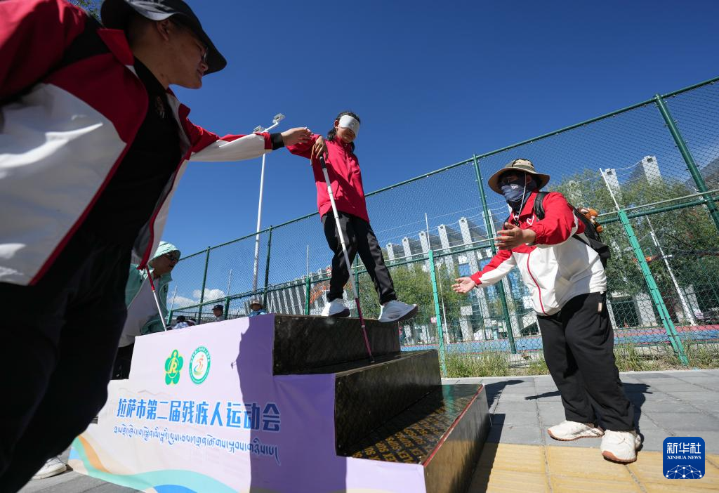 這是8月19日拉薩市特殊教育學校代表隊選手加永拉姆(右二)在盲人定向行走比賽中。新華社記者 晉美多吉 攝 ??