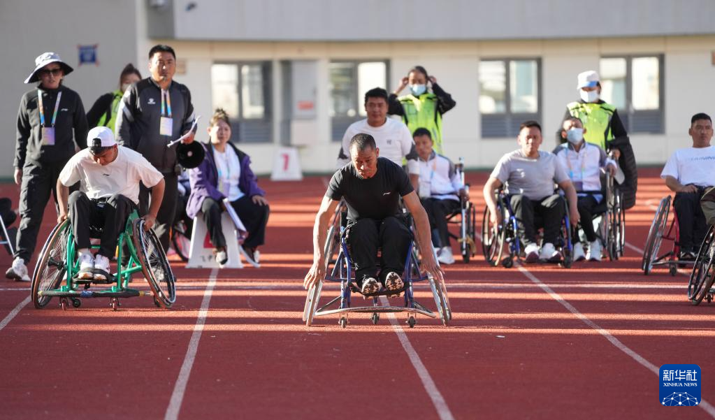 這是8月19日堆龍德慶縣代表隊選手西繞(前中)在50米輪椅速度賽中。新華社記者 晉美多吉 攝