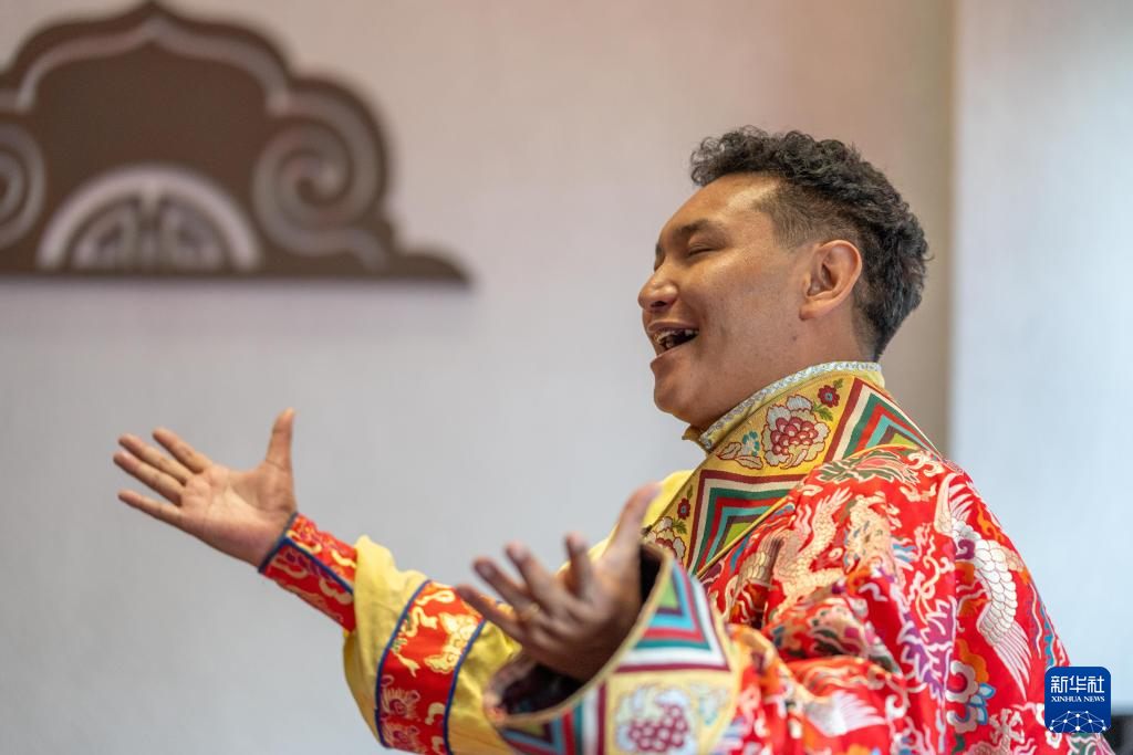 9月13日,格薩爾說唱藝人斯塔多吉在發(fā)布儀式現(xiàn)場表演格薩爾說唱。新華社記者 旦增尼瑪曲珠 攝