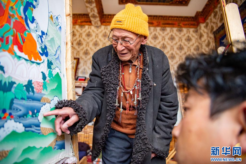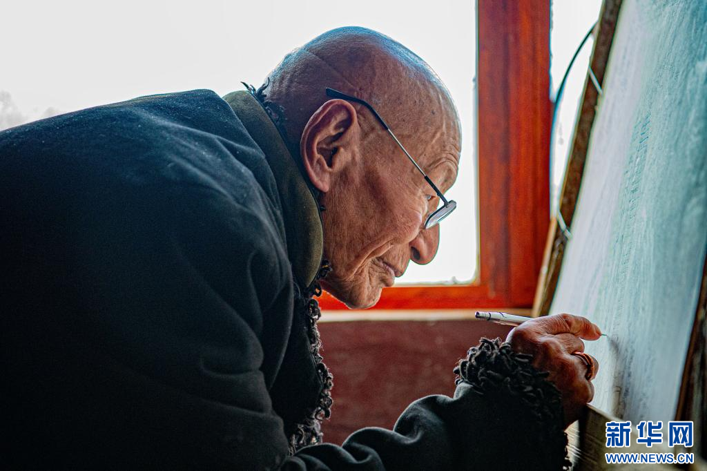 10月17日,今年92歲的昌都嘎瑪嘎赤畫派國家級非遺傳承人嘎瑪?shù)吕赵诩耶嬏瓶?。新華網(wǎng) 旦增努布 攝