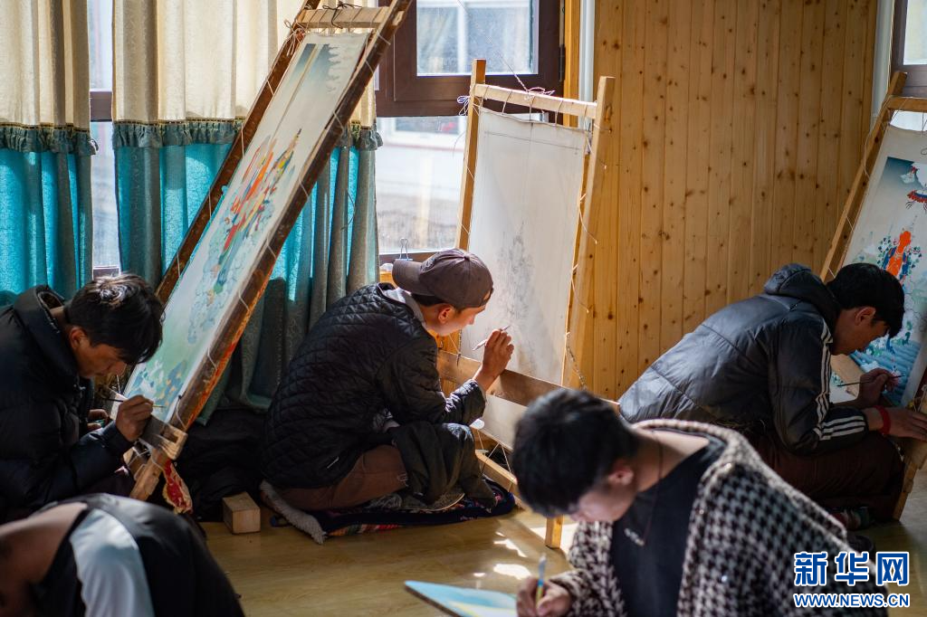 10月17日,嘎瑪?shù)吕赵谥笇W員畫唐卡。新華網(wǎng) 旦增努布 攝