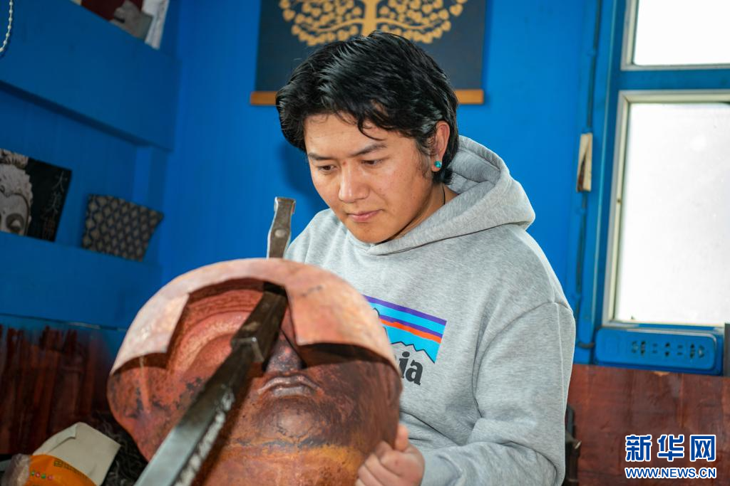 10月17日,西藏昌都市非物質(zhì)文化遺產(chǎn)代表性項目“巴爾瑪錘揲法造像技藝 ”代表性傳承人嘎瑪次仁朗加在打制西藏傳統(tǒng)造像。新華網(wǎng) 旦增努布 攝