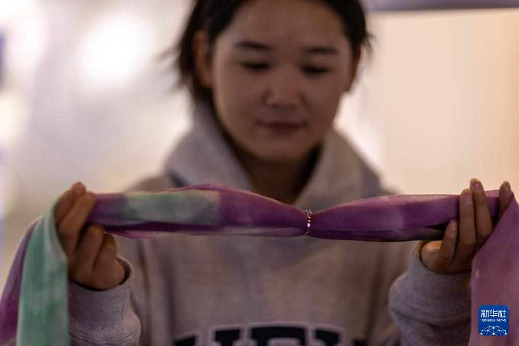 日土縣白山羊絨產(chǎn)業(yè)展示中心的工作人員在展示“指環(huán)披肩”(11月16日攝)。新華社記者 姜帆 攝