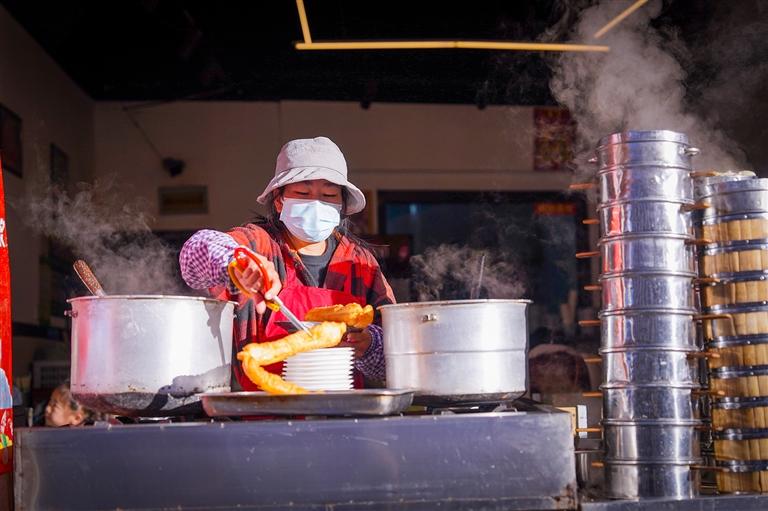 早上九點(diǎn),楊三姐的早餐店里生意正好,她一邊炸著韭菜盒子一邊忙碌地招呼著顧客。“嬢嬢,幫我把油條剪成小段?!鄙习嘧鍎⑴縼淼降昀?,買了一份豆?jié){油條。她說:“早上冷,我喜歡把油條泡進(jìn)滾燙的豆?jié){里吃,很暖和?!闭艋\揭開,一股股蒸騰的熱氣撲面而來,包子面皮軟糯,內(nèi)里餡料飽滿,趁熱咬上一口,濃郁的香味喚醒還在沉睡的味蕾。楊三姐告訴記者:“除了面點(diǎn),也有很多人愛點(diǎn)豌雜面等粉面,早上喝口熱湯才舒服?!?/p>