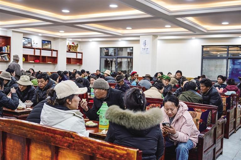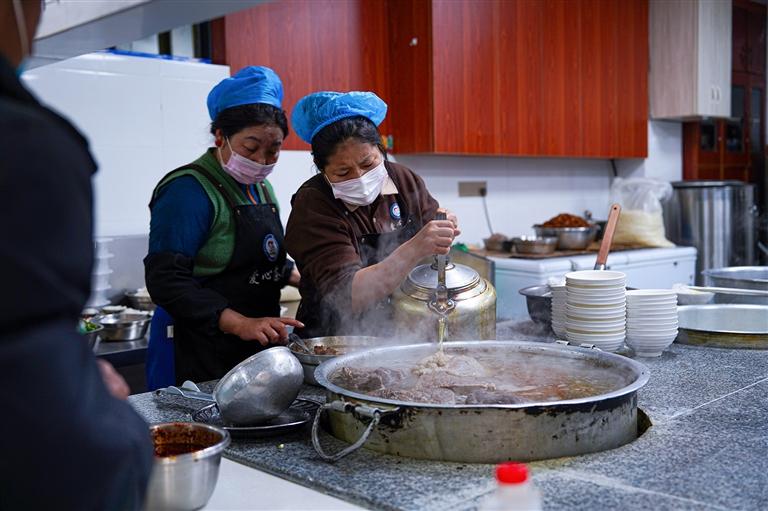 街頭的甜茶館里,時(shí)不時(shí)傳來歡聲笑語,這里是拉薩冬日最溫暖的角落。在這里,人們臉上的笑容在氤氳的熱氣中若隱若現(xiàn),醇厚的茶香在小小的茶館內(nèi)裊裊升騰,酥油茶在長柄壺中微微蕩漾,絲滑的茶水傾入食客們的木碗,泛起細(xì)膩的泡沫。此時(shí),阿佳端著一碗碗藏面上桌,質(zhì)樸的笑容驅(qū)散了冬日的寒意,溫暖著每一個(gè)過客的心房。