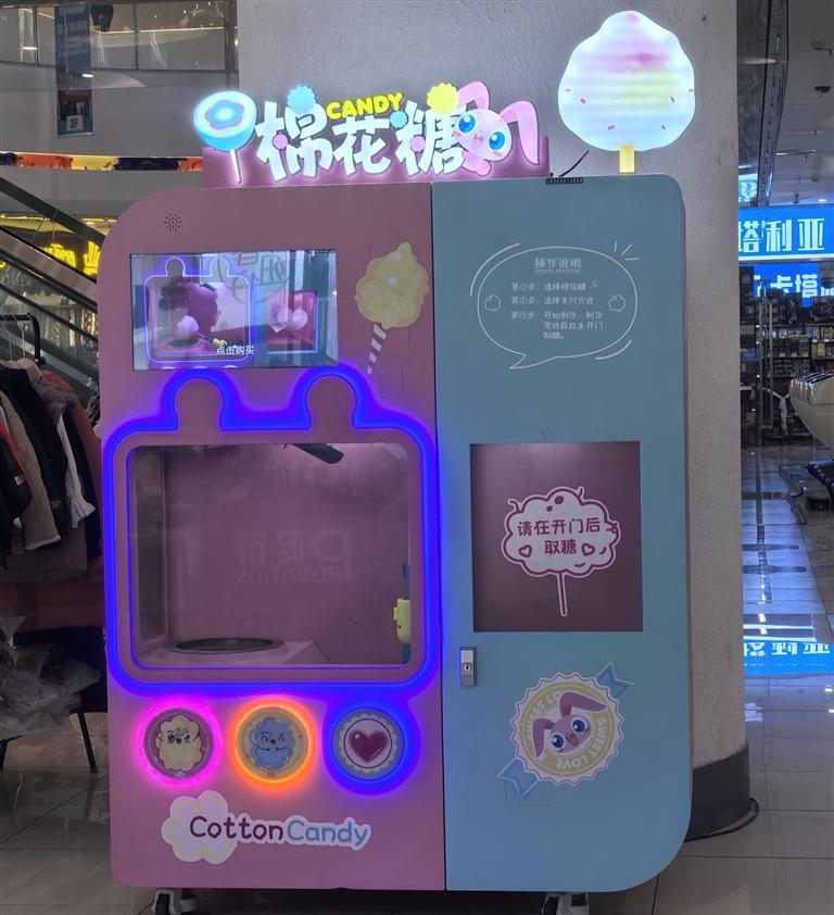 除了自助游戲機(jī),自助棉花糖機(jī)也是一大亮點(diǎn)。在拉薩市多家大型商超內(nèi),自助棉花糖機(jī)成為了孩子們的新寵。記者走訪發(fā)現(xiàn),目前拉薩各大商場內(nèi)的棉花糖機(jī)大多為同一品牌,機(jī)子中的棉花糖有42種,一個(gè)棉花糖售價(jià)19.9元。市民可以根據(jù)口味、顏色、造型選擇棉花糖,操作流程也十分便捷,選購后掃碼支付即可。