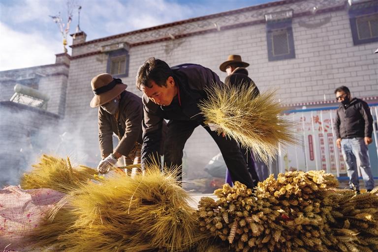 走進桑木村,房屋錯落有致,廣場上,村民們在冬日暖陽下忙碌著。有的正在煮顏料為麥穗和青稞穗上色,有的正在捆綁曬干的“羅薩梅朵”?!盀榱朔奖阒谱鳎覀兏鶕?jù)外形給這些麥穗和青稞穗起了名字,比如這個禿禿的叫‘古日’,這個最長的叫‘扎日’,還有‘阿索’和‘梅朵’?!?4歲的村民其米卓嘎與幾位姐妹圍坐在一起,一邊捆綁“羅薩梅朵”,一邊笑著向記者介紹,手上動作絲毫未停?!昂芏嗳诉^年講究儀式感,會選擇買齊這四種,但大部分人會從中選兩種。”