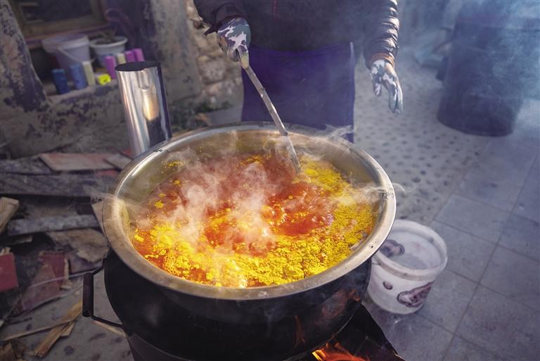 “玫紅色和黃色的都做完了吧?這個顏料水我倒了,開始準(zhǔn)備制作青色?!币慌?,61歲的央金將盆洗干凈,繼續(xù)煮水放入顏料?!啊_薩梅朵’有青色、綠色、玫紅色、黃色四種顏色,其中青色耗時最長,不僅需要自己調(diào)制,而且最難上色?!毖虢鹫f,“我們一般是早上7點開始上色,上完色都快下午4點了?!?/p>