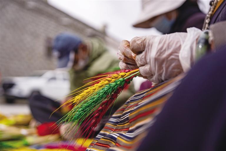 從春耕、夏耘、秋收到冬天的染色、晾干、捆綁、售賣,“羅薩梅朵”的制作過程并不簡單,種植和上色都極其辛苦。卓瑪次仁告訴記者:“每年4月,我們開始種植小麥和青稞,澆水施肥。9月收割時,我們會挑選顆粒飽滿的麥穗和青稞穗,捆綁后去皮曬干。10月,將它們收入屋中,一層層壘起來,房間最好朝陽且沒有老鼠。11月,開始采購顏料和捆扎用的毛線。”