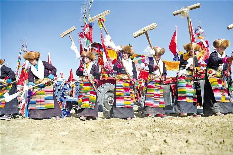 圖為扎其鄉(xiāng)藏仲村村民們?cè)谂e行春耕儀式。記者 潘多 攝