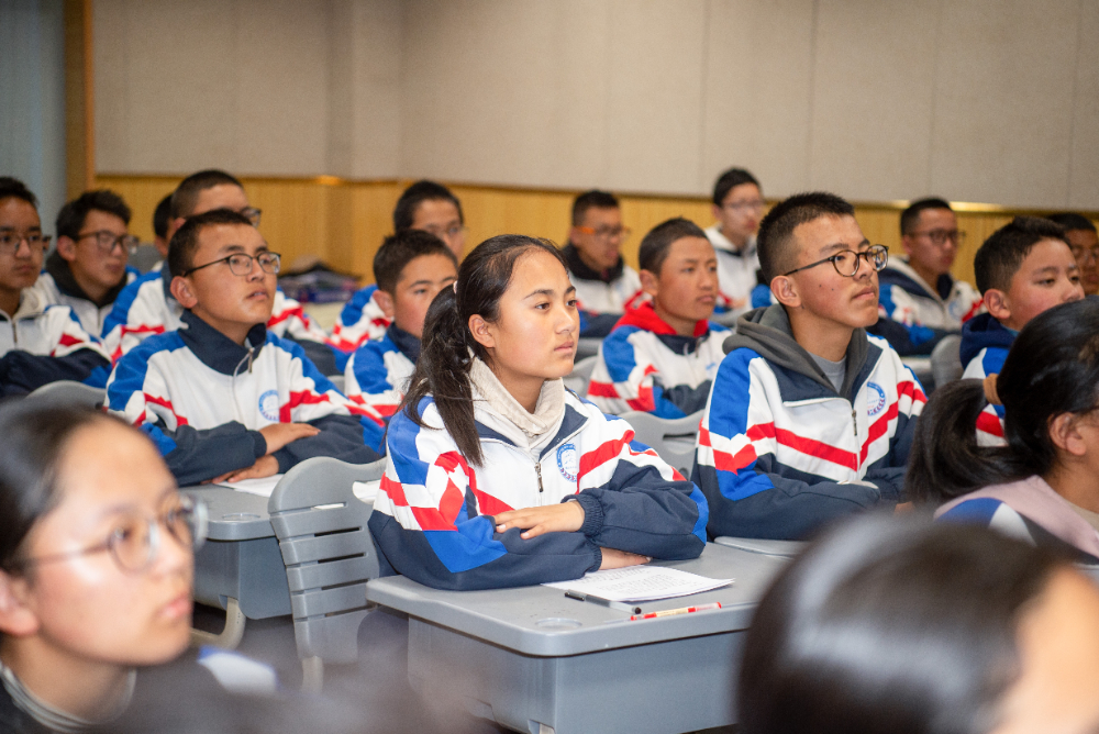 4月11日,拉薩江蘇實(shí)驗(yàn)中學(xué)的學(xué)生在認(rèn)真聽(tīng)江蘇省如東高級(jí)中學(xué)的宣講。新華網(wǎng) 旦增努布 攝?