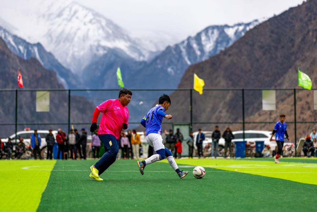 夢想終有回響。2024年,洛隆縣與對口支援企業(yè)中國遠(yuǎn)洋海運(yùn)集團(tuán)一道在土球場附近,投資200余萬元建成一座占地8000余平方米的11人制標(biāo)準(zhǔn)足球場,當(dāng)年12月順利竣工,被當(dāng)?shù)厝擞H切喚作“云上球場”。