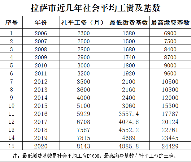 根據(jù)西藏自治區(qū)人社廳、西藏自治區(qū)財政廳、西藏自治區(qū)統(tǒng)計局《關于發(fā)布2020年上年度全區(qū)職工月平均工資的通知》(藏人社發(fā)〔2020〕82號)精神,2020年社會平均工資為8143元/月,新的繳費基數(shù)上下限及繳費標準從2020年1月1日起執(zhí)行。