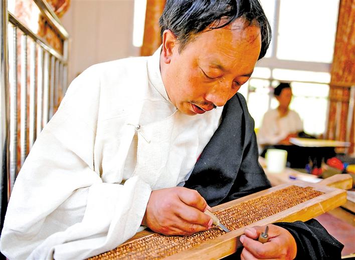 江達波羅古擇木刻技藝自治區(qū)級傳承人朗加。