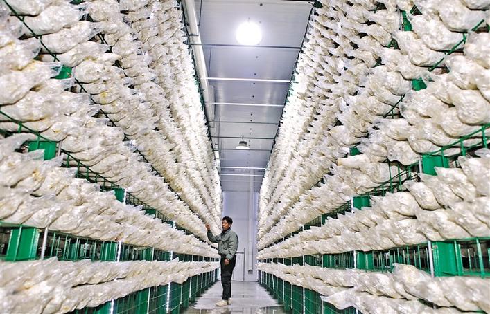 圖為園區(qū)工作人員查看食用菌長(zhǎng)勢(shì)情況。記者 唐斌 次旺 攝