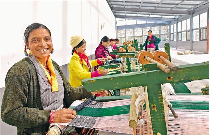 吉隆縣吉隆鎮(zhèn)的達曼人普布曲宗在合作社從事編織工作。