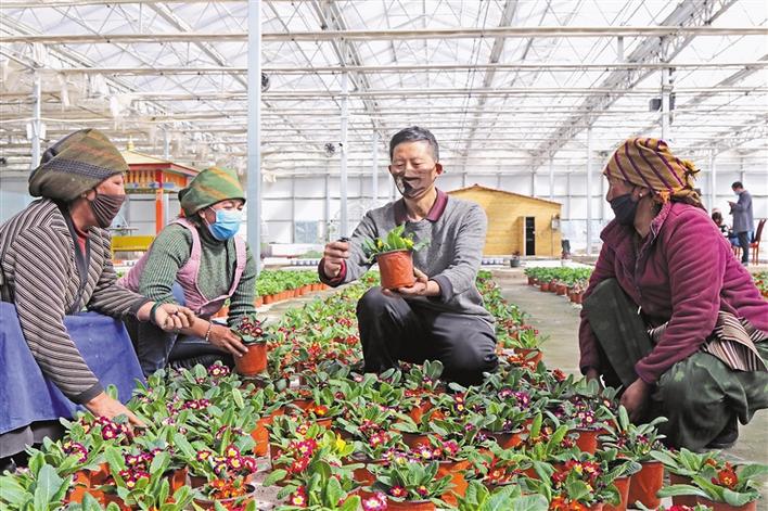 林周縣陽光溫室示范園區(qū)技術人員在指導村民種植花卉。