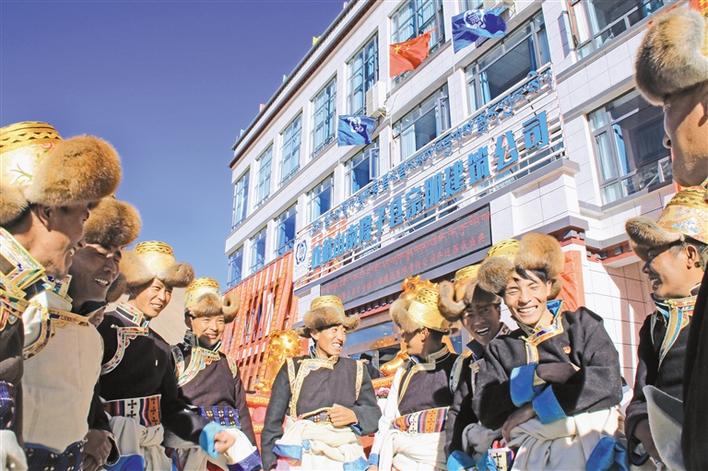 隆子縣宗那建筑公司新辦公樓前,農(nóng)牧民務工人員慶祝企業(yè)喬遷。