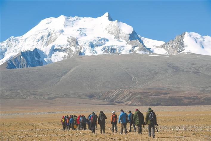 圖為希夏邦馬雪山下,戶(hù)外運(yùn)動(dòng)的人們?cè)谙驅(qū)ьI(lǐng)下徒步。記者 李洲 攝
