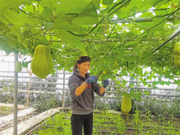 圖為在日喀則珠峰現(xiàn)代農(nóng)業(yè)科技創(chuàng)新博覽園內(nèi),工作人員正在修剪佛手瓜的枝葉。記者 陳林 攝