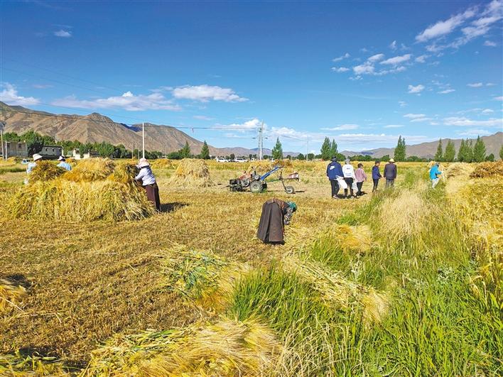 日喀則市江孜縣重孜鄉(xiāng)群眾在搶收青稞。本報記者 李梅英 攝