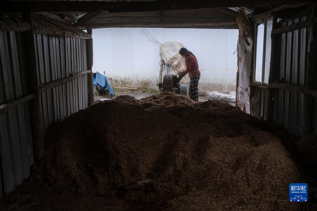 明珠措姆在碾碎玉米芯,準備制作菌棒(4月14日攝)。