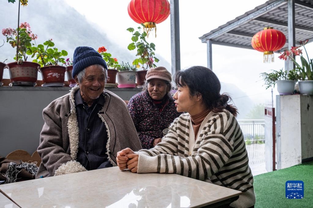 桑杰來(lái)坡與村干部聊天(4月15日攝)。新華社記者 孫非 攝
