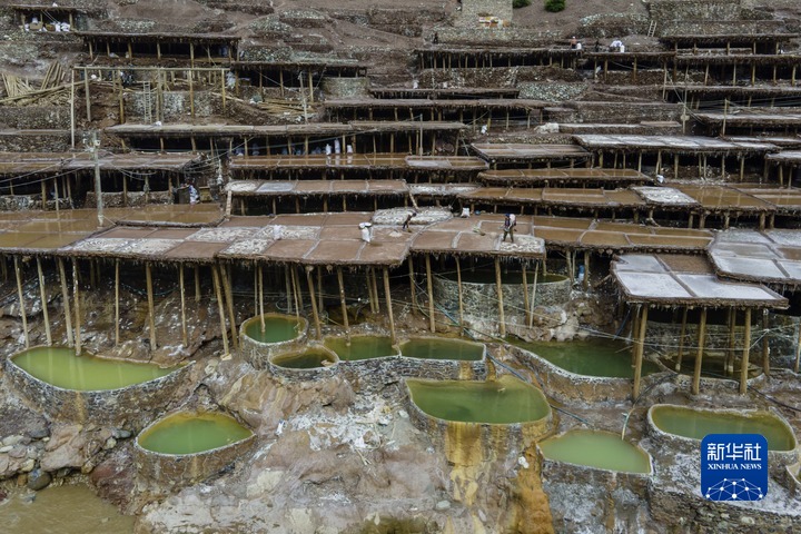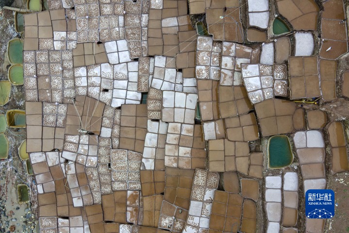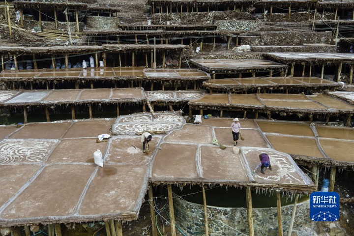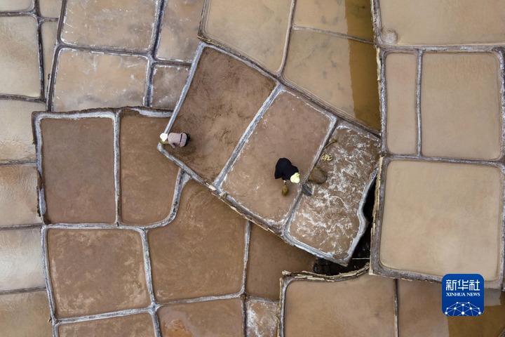 加達村村民在古鹽田里勞作(無人機照片,5月26日攝)。新華社記者 周荻瀟 攝
