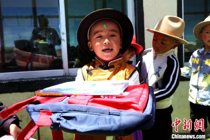 圖為普瑪江塘鄉(xiāng)小學生領取書包等學習用具?!±丝ㄗ涌h網(wǎng)信辦供圖