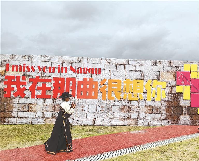 盛裝參加賽馬節(jié)的群眾經(jīng)過“我在那曲很想你”打卡點。