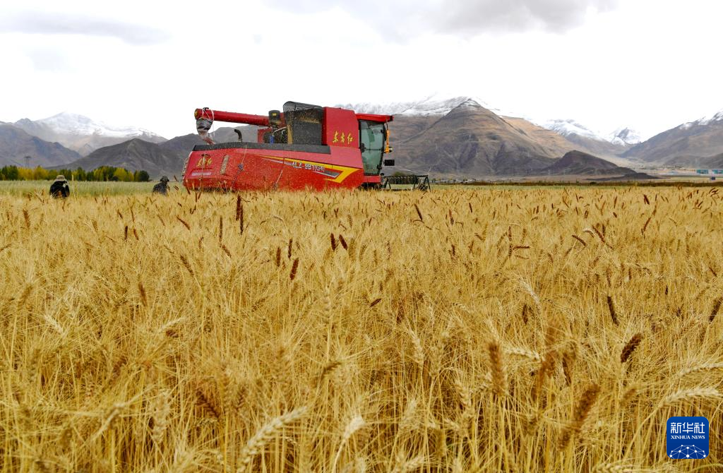 ??工作人員駕駛農(nóng)業(yè)機械在西藏拉薩市林周縣曲果強村的高標準農(nóng)田里收獲小麥(10月12日攝)。新華社記者 張汝鋒 攝