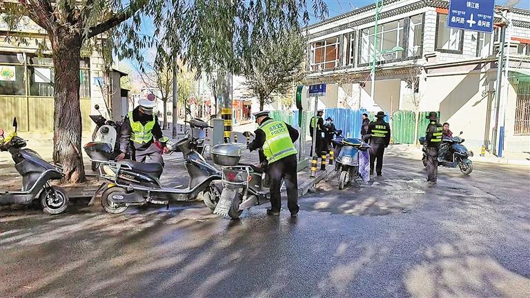 達孜區(qū)交警整頓非機動車亂停亂放等違法行為。拉薩記者站 攝