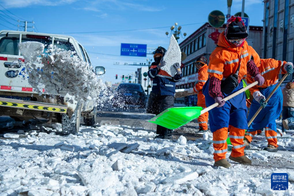 12月15日,環(huán)衛(wèi)工人們?cè)谇鍜叻e雪。新華社發(fā)(旦增努布攝)
