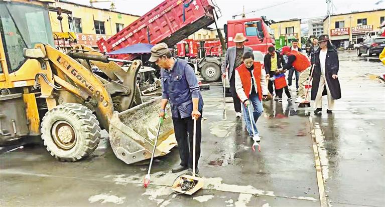 巴宜區(qū)尼池社區(qū)的工作人員身穿紅馬甲,手拿鐵鍬、掃帚等工具對林芝市快修市場附近的垃圾雜物進行清理,“黨建引領聚合力 環(huán)境整治我先行”的標語迎風飄揚;