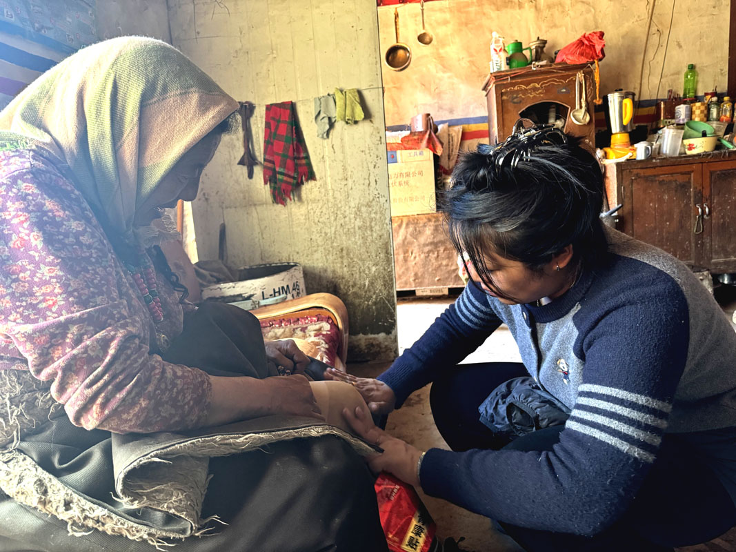 圖為駐村工作隊(duì)員德慶巴吉(右一)正在為阿益奶奶貼膏藥貼。