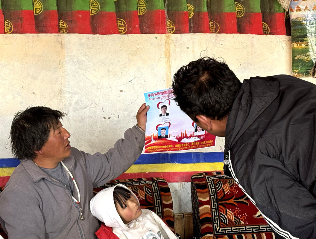 圖為駐村工作隊(duì)員弟古(右一)正在向珠扎介紹駐村工作隊(duì)便民聯(lián)系卡內(nèi)容。