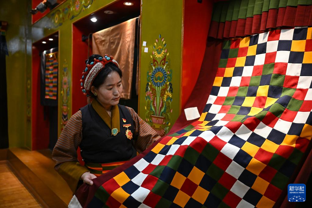 西藏日喀則市仁布縣特色產(chǎn)業(yè)孵化園,亞德細褐紡織手工藝傳承人南木珍在展示作品